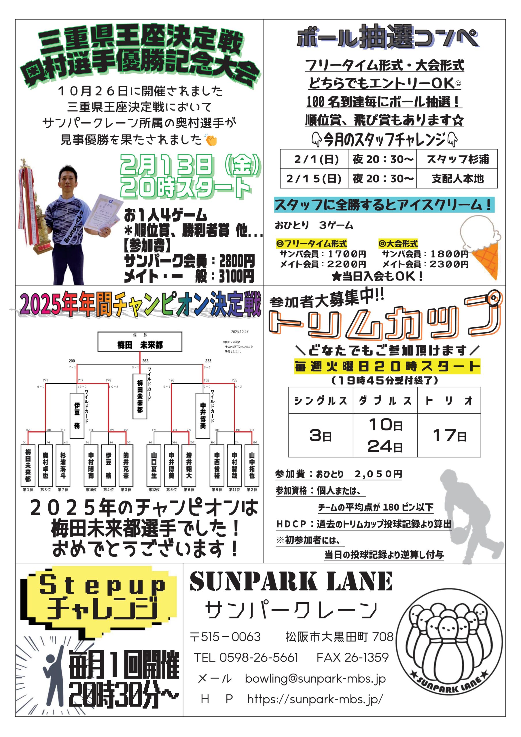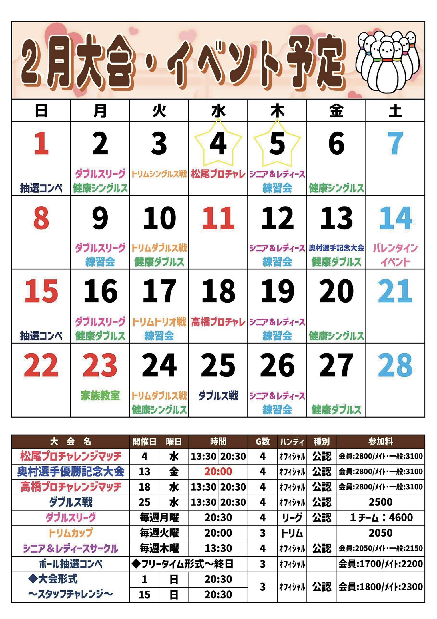 2月大会・イベントスケジュール【ボウリング】 2026.01.21 Tweet Share Hatena Pocket RSS feedly Pin it 1月レッスンプログラム【スポーツクラブ】 前の記事