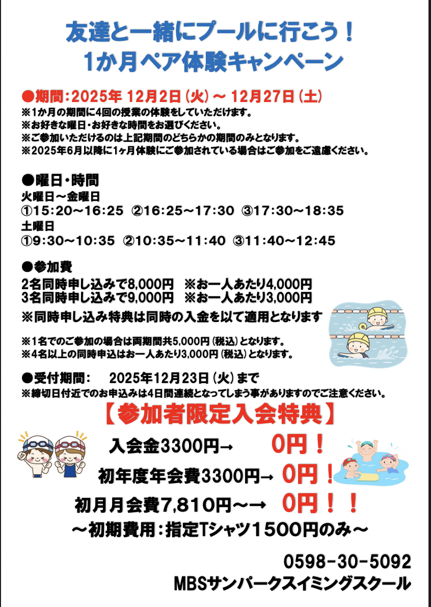 12月1ヶ月ペア体験実施中♪【スイミングスクール】 2025.12.3 お友達を誘って体験すればお得です!!! お友達を誘えば誘うほどお得に1ヶ月体験が出来ます♪ 2名での参加 2名でで8000円(1名当たり4000円) 3名での参加 3名で9000円(1名あたり3000円) 4名以上 お一人3000円ずつ追加 1ヶ月体験参加後のお得な入会特典もございます♪ 詳しくは下記をごらんください! お問い合わせ先 0598−30−5092 Tweet Share Hatena Pocket RSS feedly Pin it 体験キャンペーン実施中!【スポーツクラブ】 前の記事
